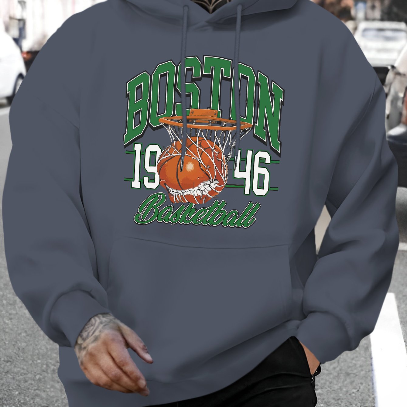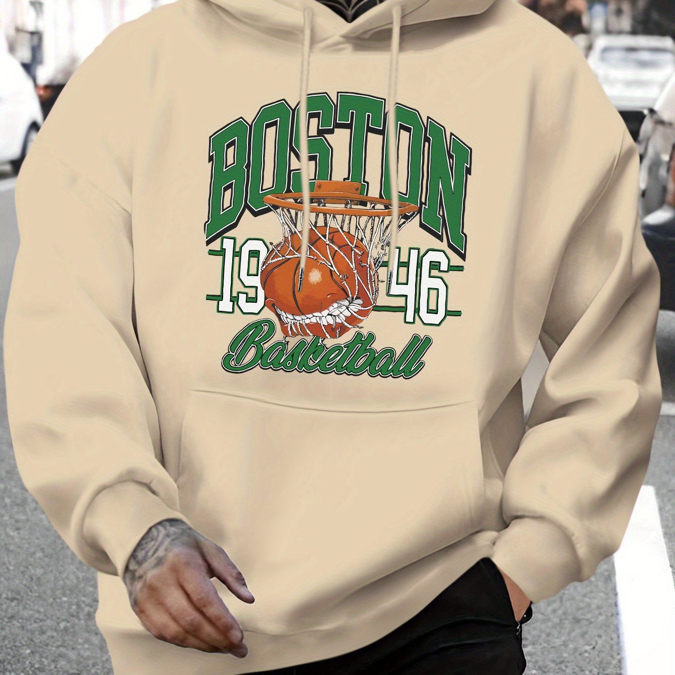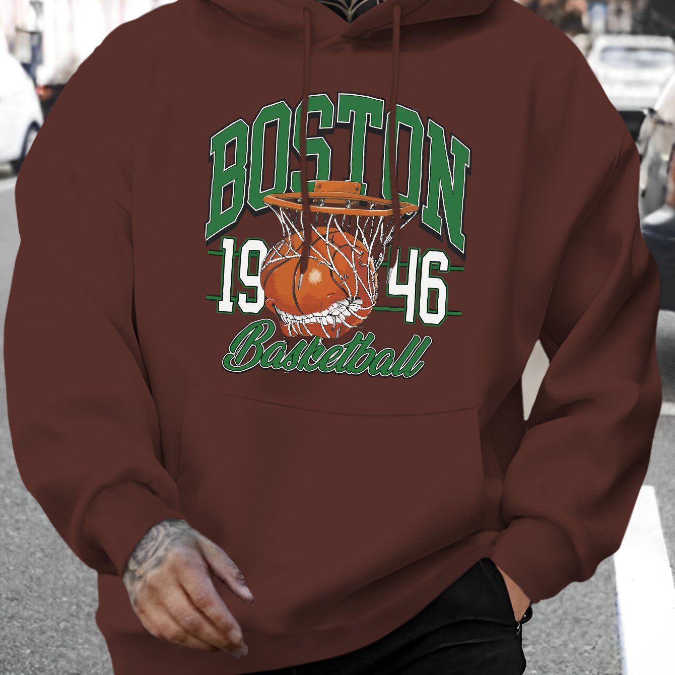 Men's Boston Letter & Basketball Print Hoodie - Casual Drawstring Pullover, Comfortable Long Sleeve with Kangaroo Pocket for Fall/Winter