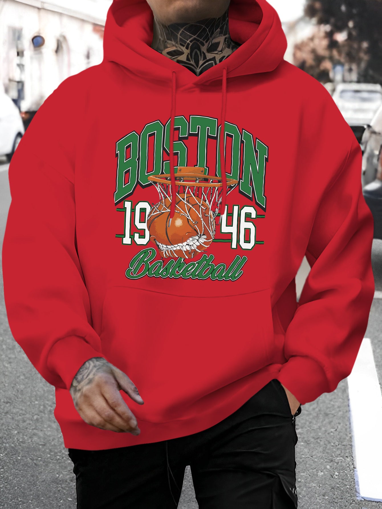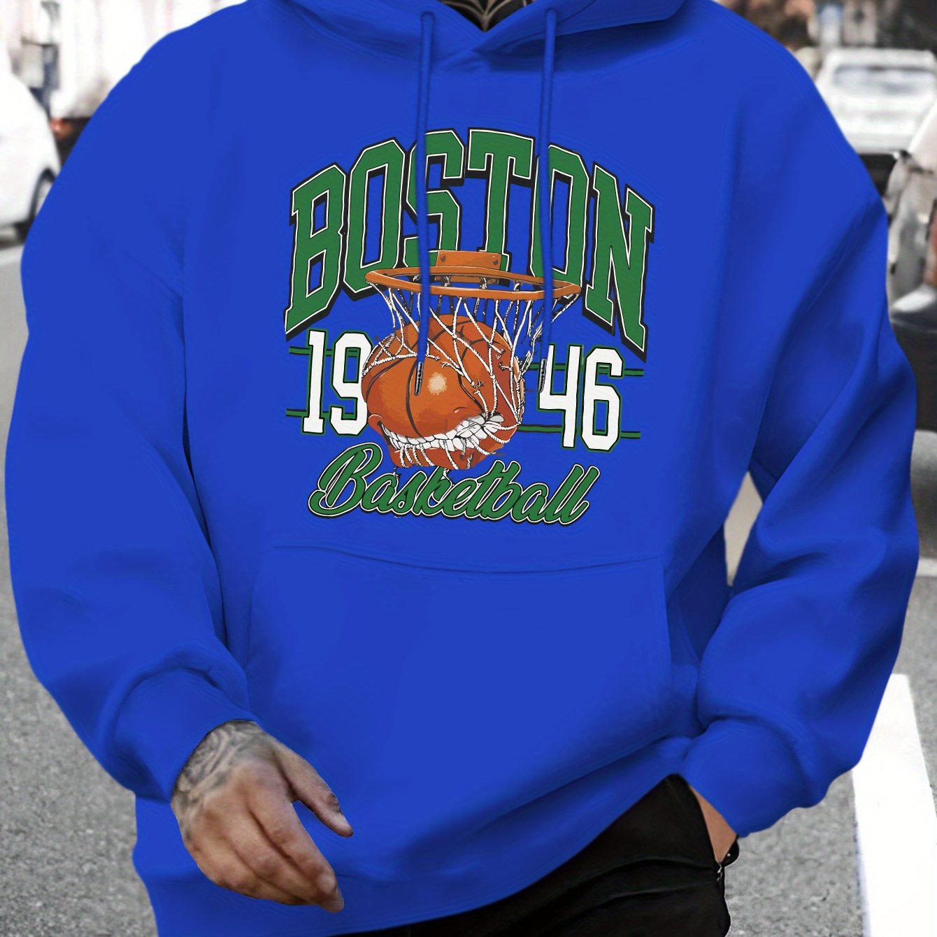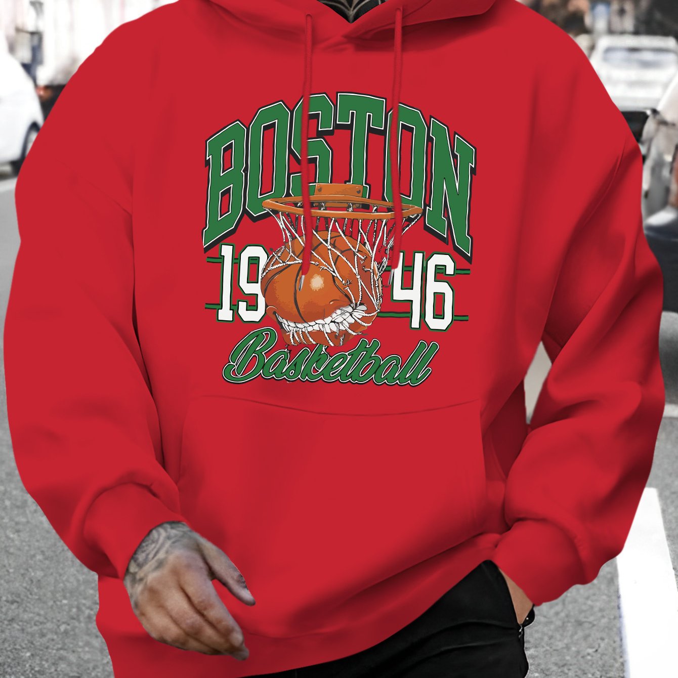 Men's Boston Letter & Basketball Print Hoodie - Casual Drawstring Pullover, Comfortable Long Sleeve with Kangaroo Pocket for Fall/Winter
