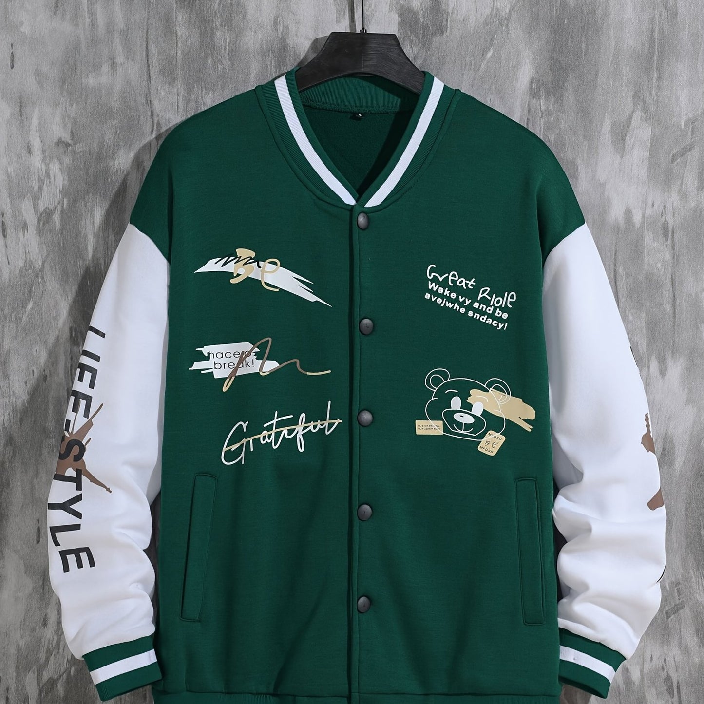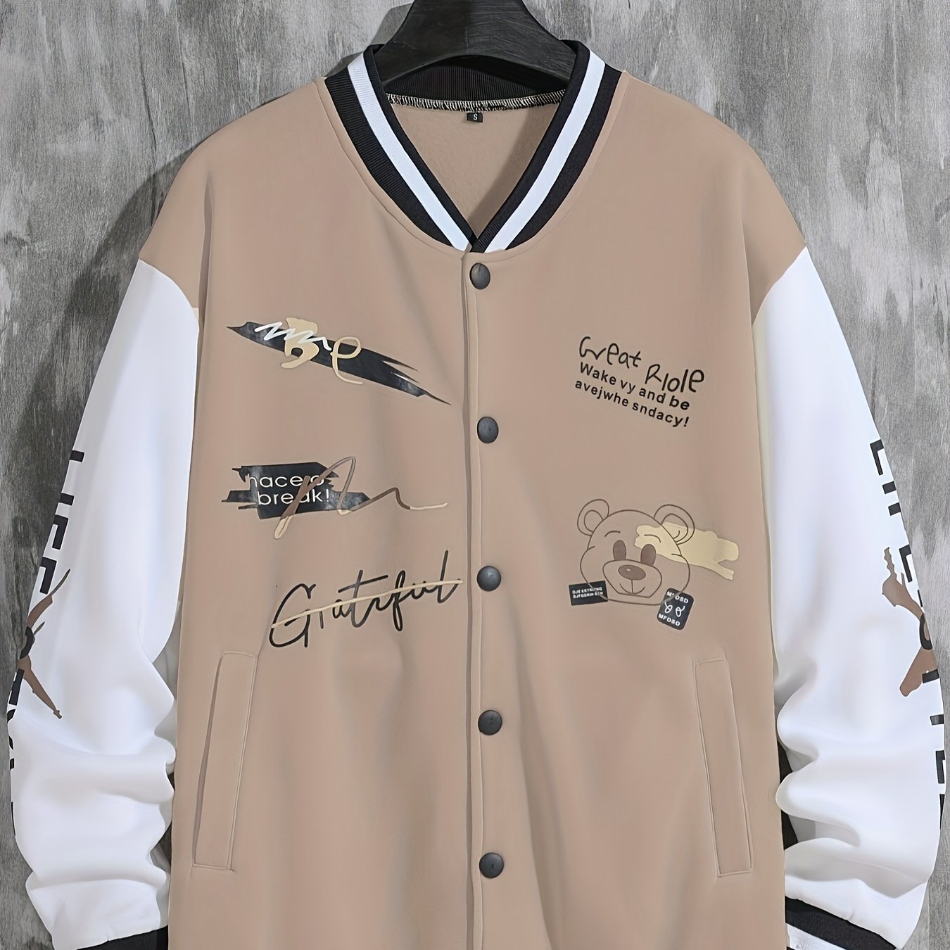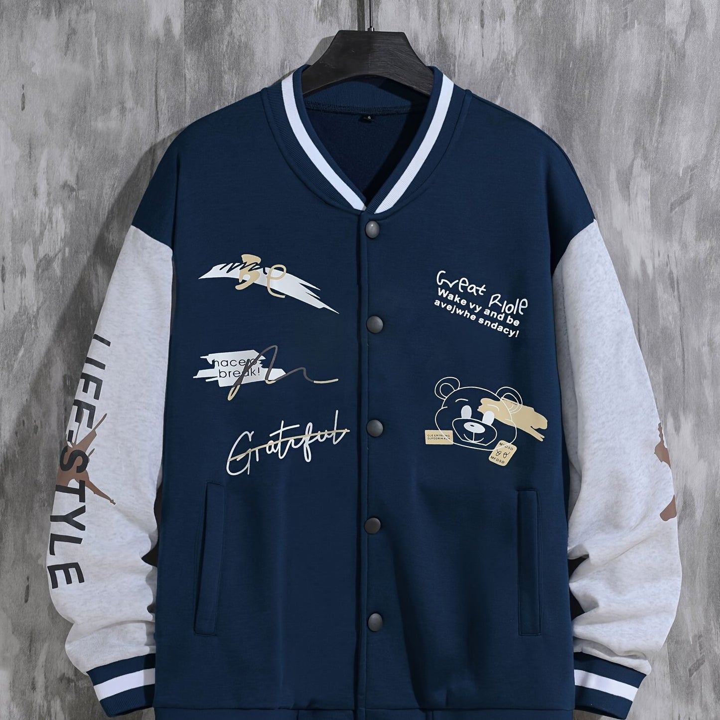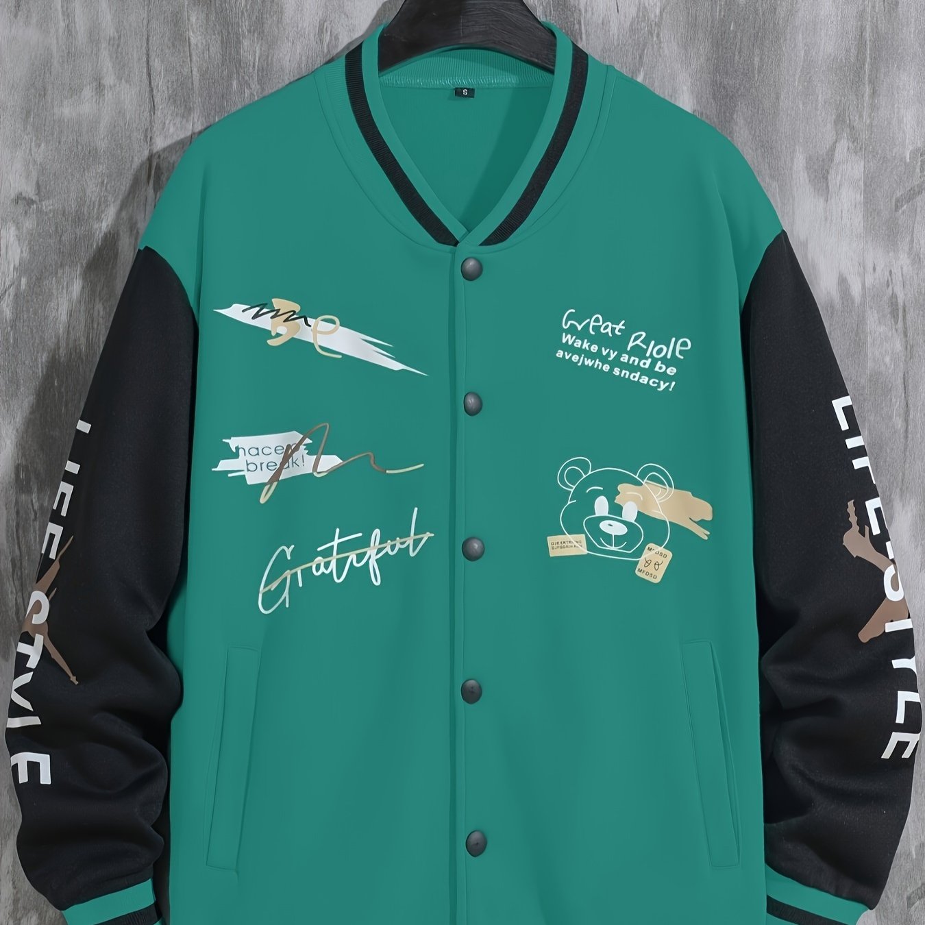 Men'S Casual Baseball Jacket, Polyester 100% Knit Fabric, Long Sleeve with Alphabet Pattern, Regular Length, Button Closure, Baseball Collar, Single Breasted Placket, Loose Fit, 200g/m² Weight - Spring/Fall Fashion