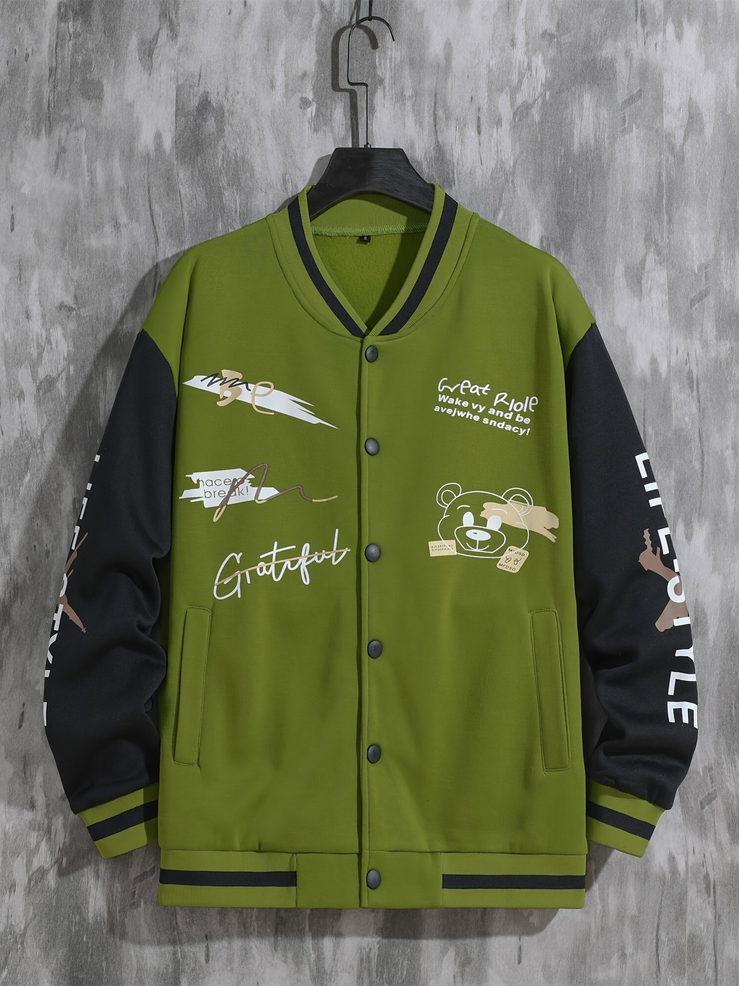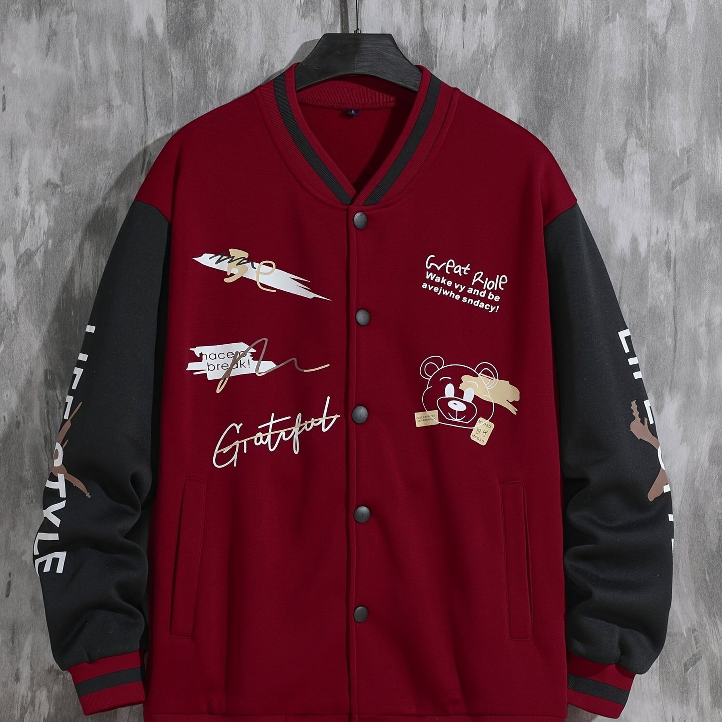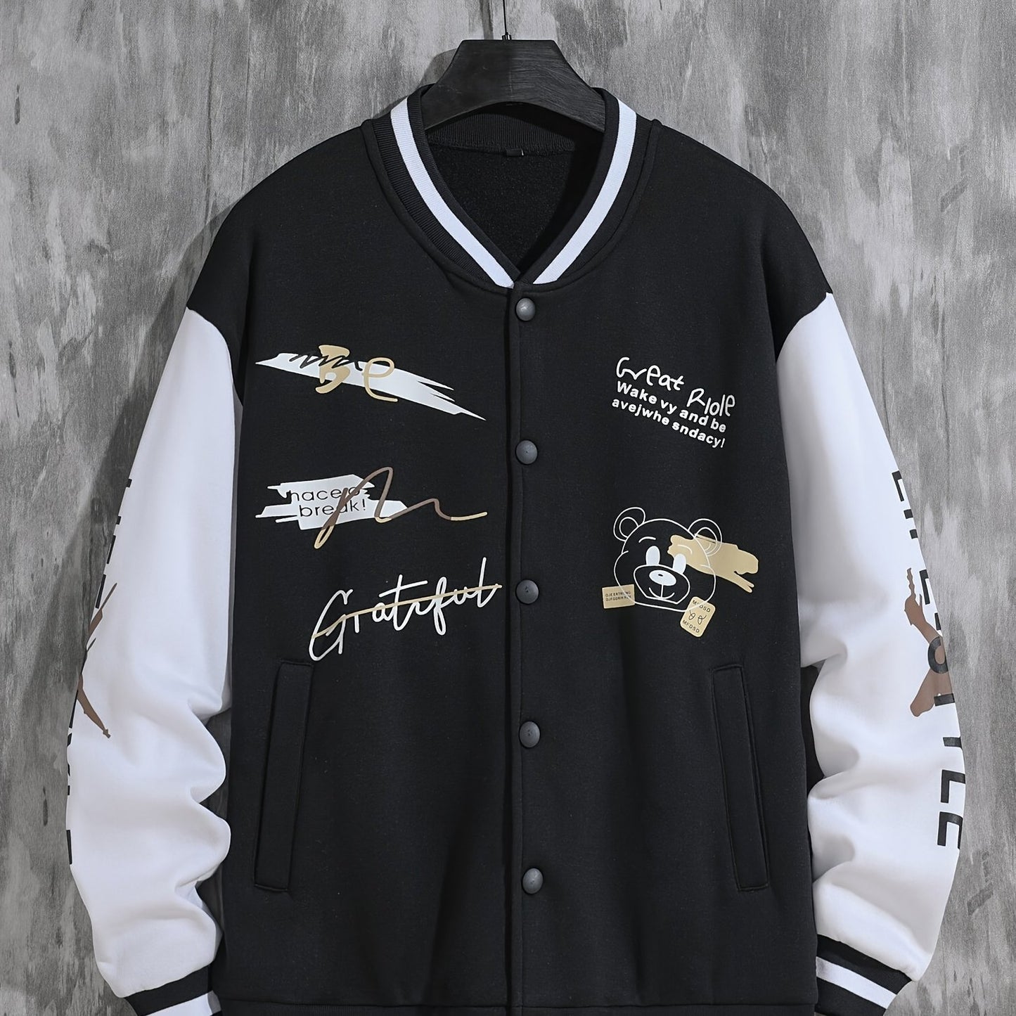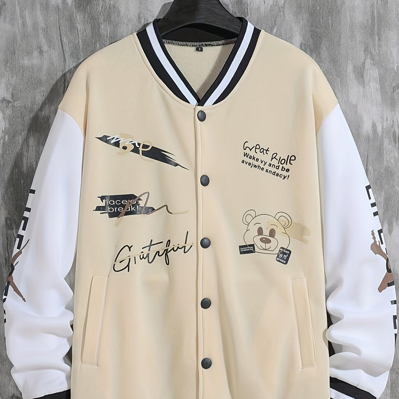 Men'S Casual Baseball Jacket, Polyester 100% Knit Fabric, Long Sleeve with Alphabet Pattern, Regular Length, Button Closure, Baseball Collar, Single Breasted Placket, Loose Fit, 200g/m² Weight - Spring/Fall Fashion