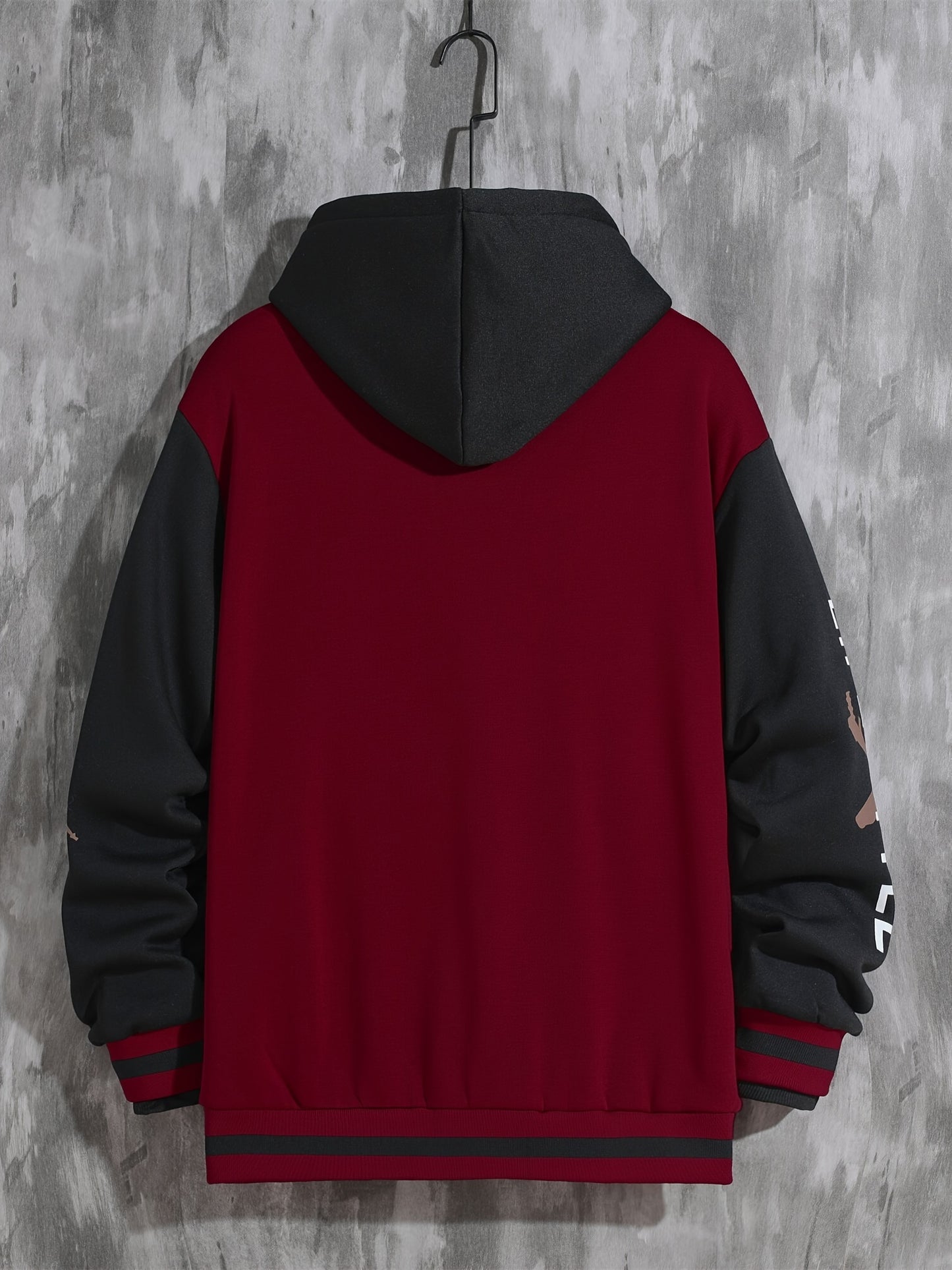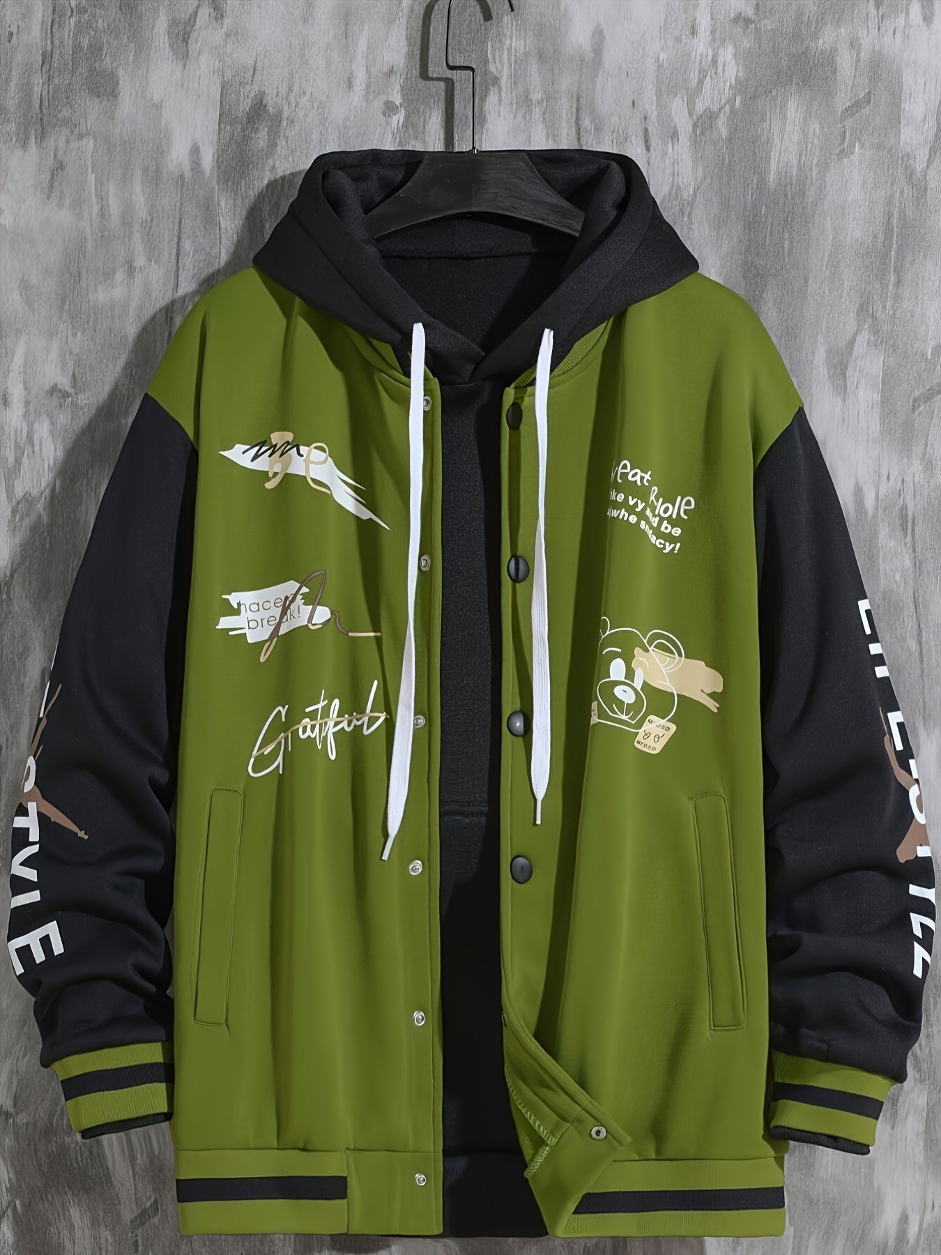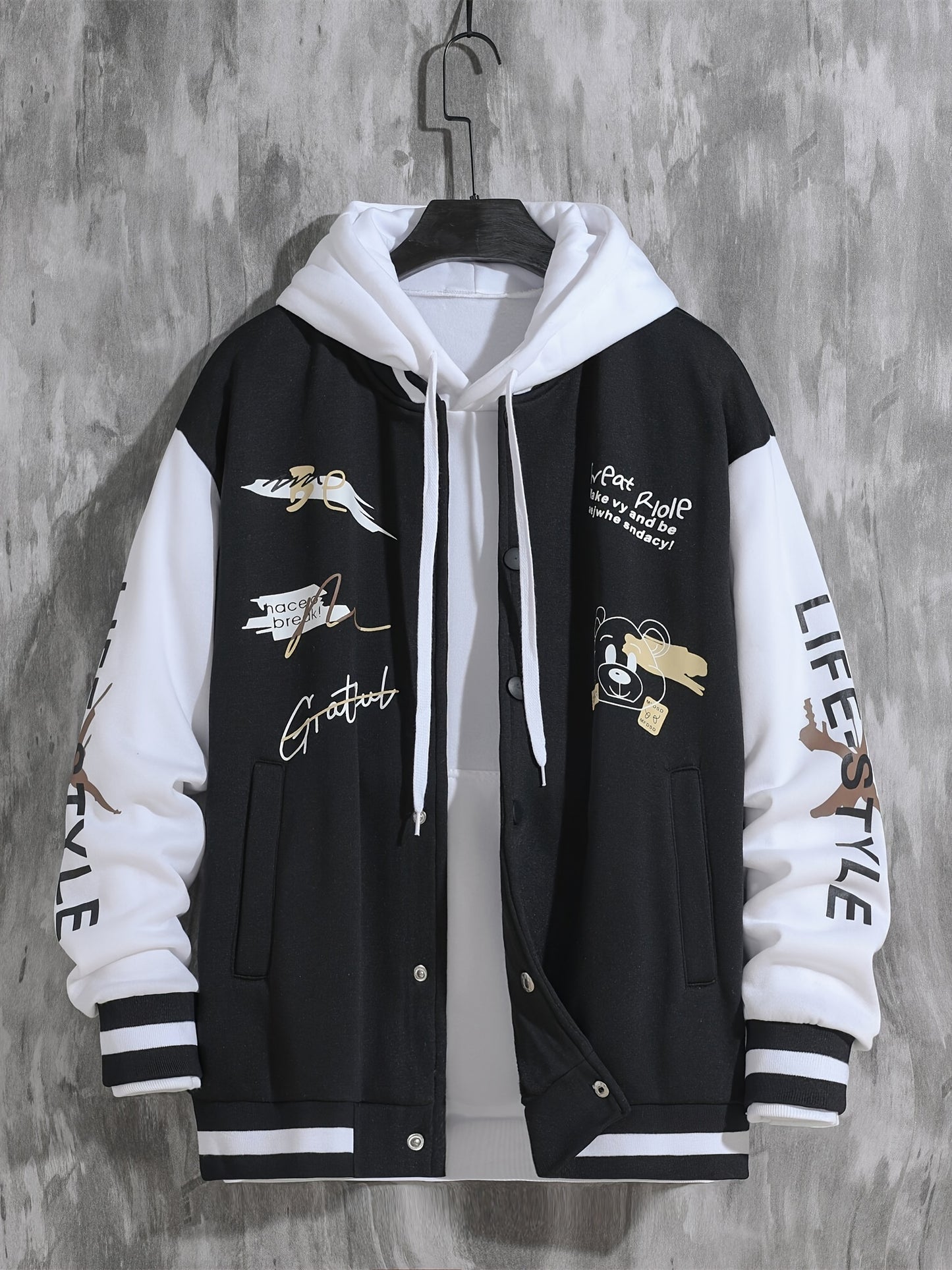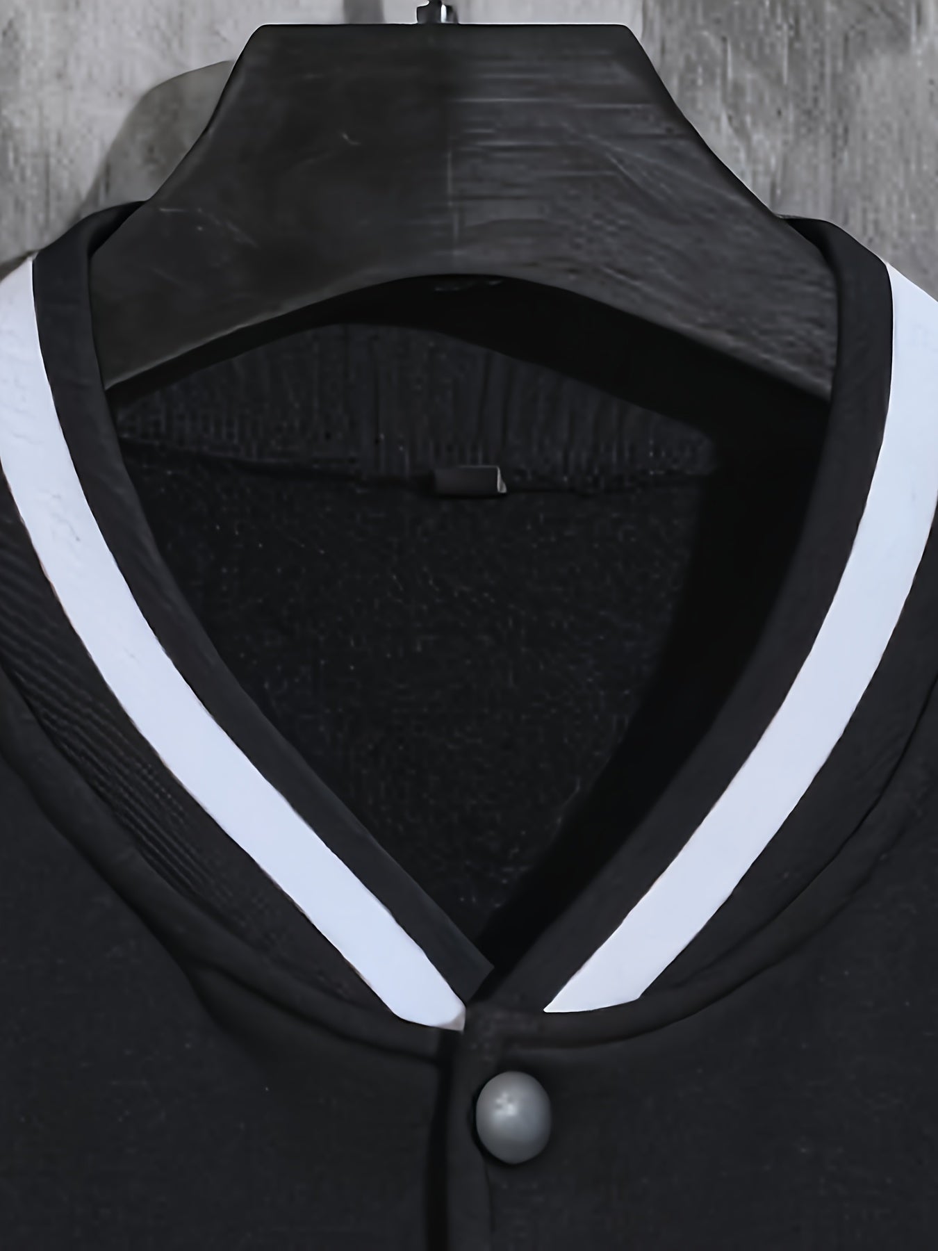 Men'S Casual Baseball Jacket, Polyester 100% Knit Fabric, Long Sleeve with Alphabet Pattern, Regular Length, Button Closure, Baseball Collar, Single Breasted Placket, Loose Fit, 200g/m² Weight - Spring/Fall Fashion
