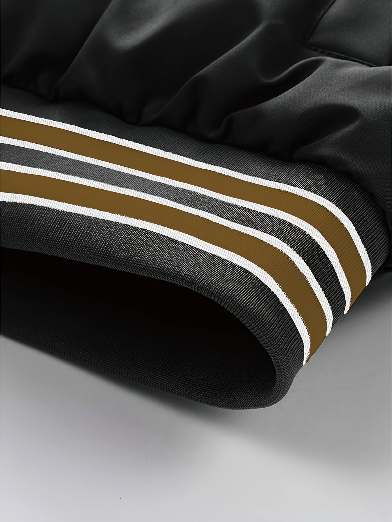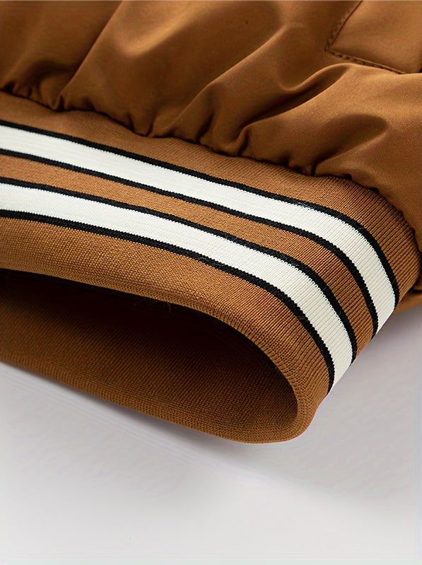 Men's Preppy Style Hooded Varsity Jacket - Casual Color Block Puffer with Embroidered Patches, Zip-Up, Long Sleeves, Polyester - Perfect for Baseball & Casual Attire, Everyday Jacket|Color Block Design|Ribbed Cuffs