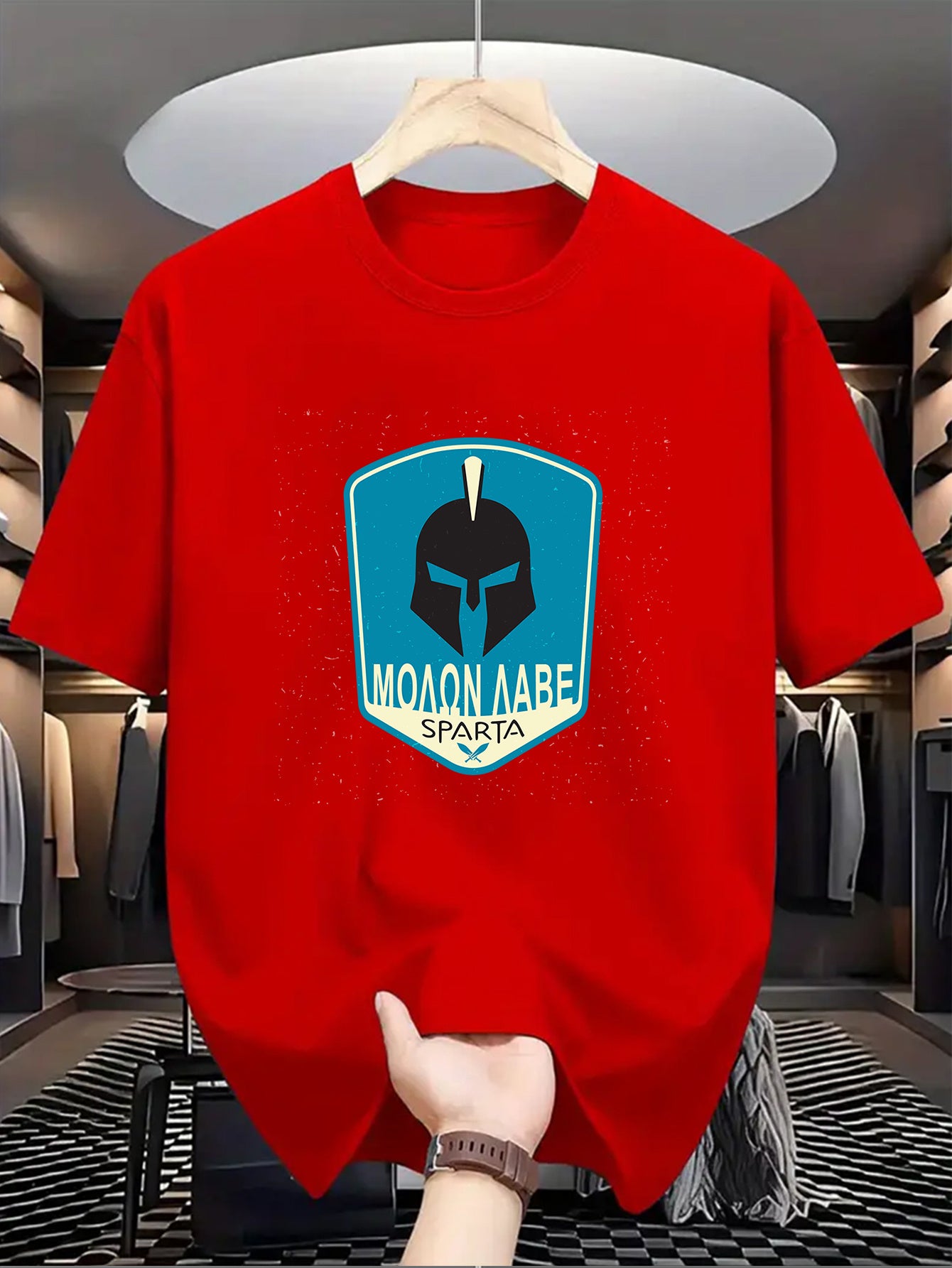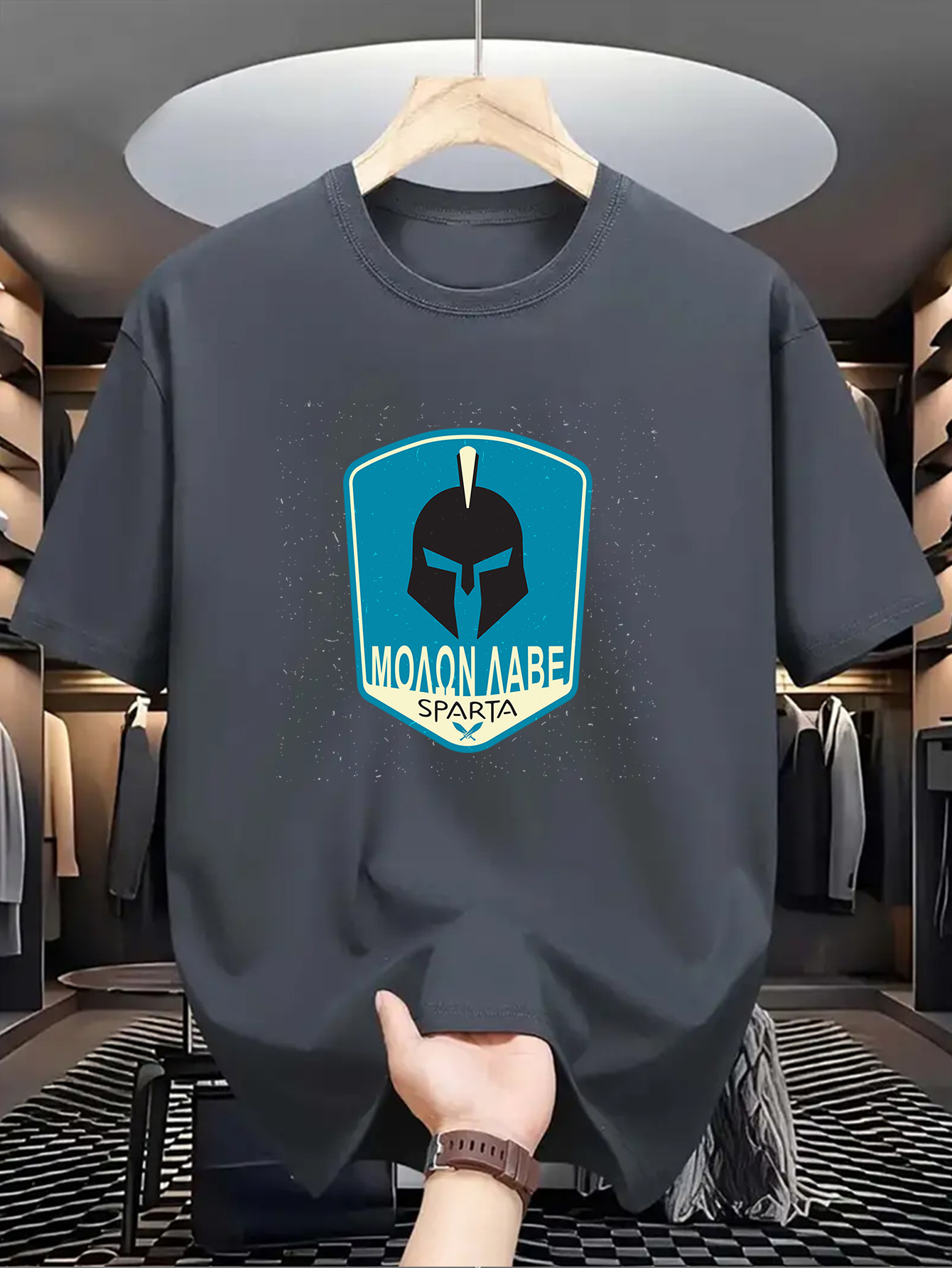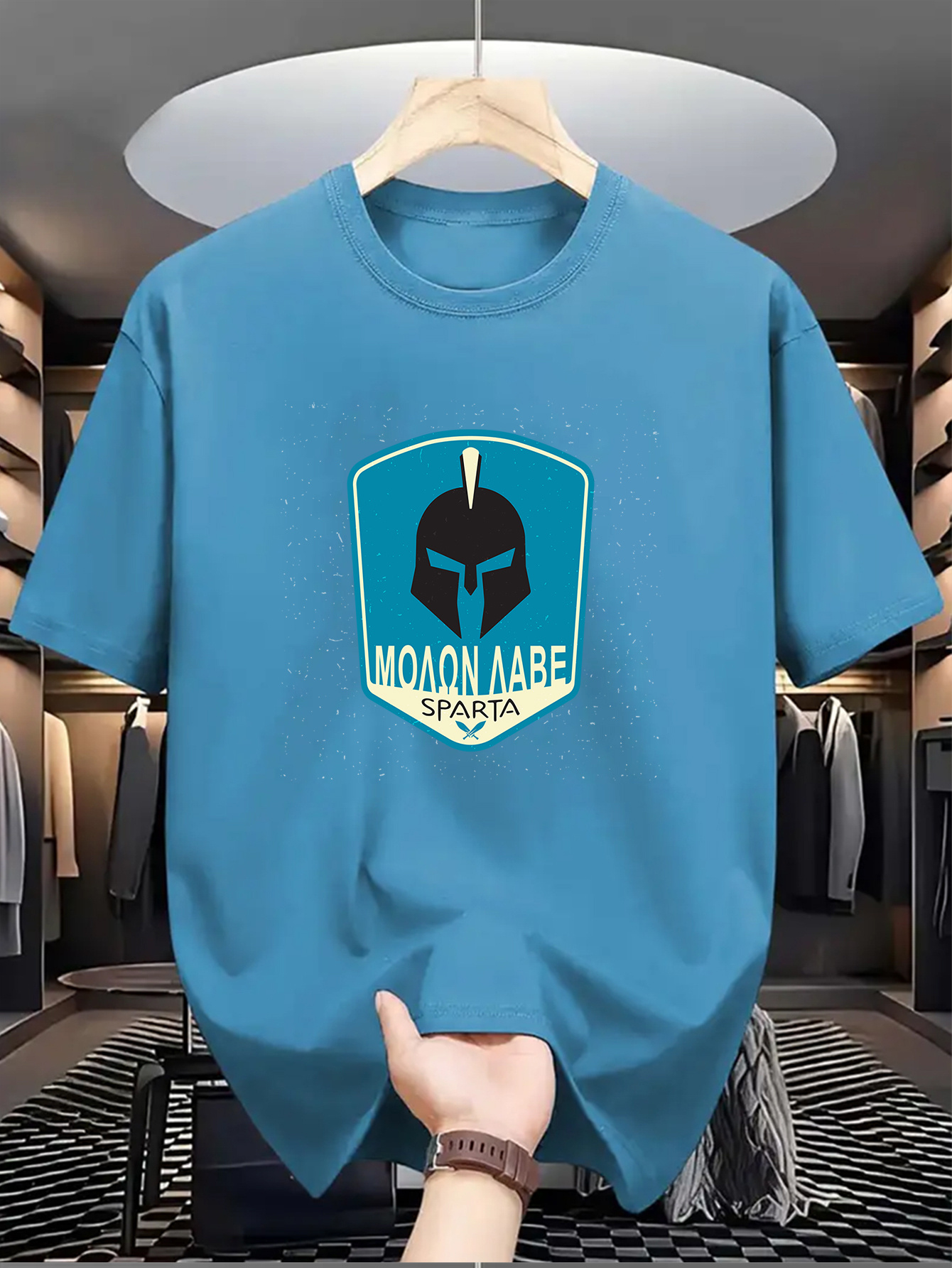 Men's SPARTA Graphic Tee - Beige Crew Neck Short Sleeve T-Shirt with Blue Spartan Helmet Design, 100% Polyester, Casual Summer Wear for Everyday & Special Occasions, Cool Oversized Tee Shirts